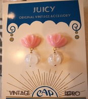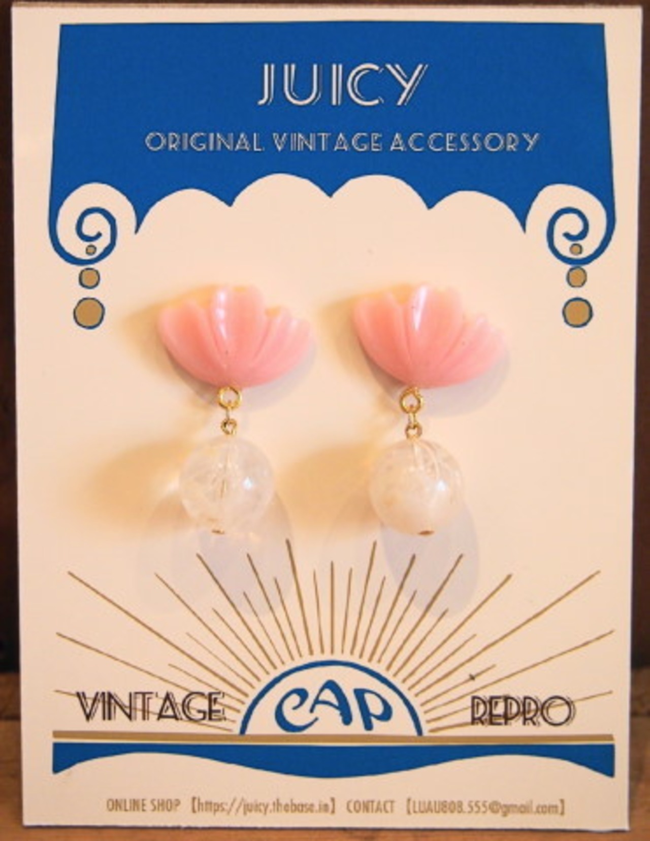 桜色のパーツにマーブル模様のアクリル玉がついたピアスです。