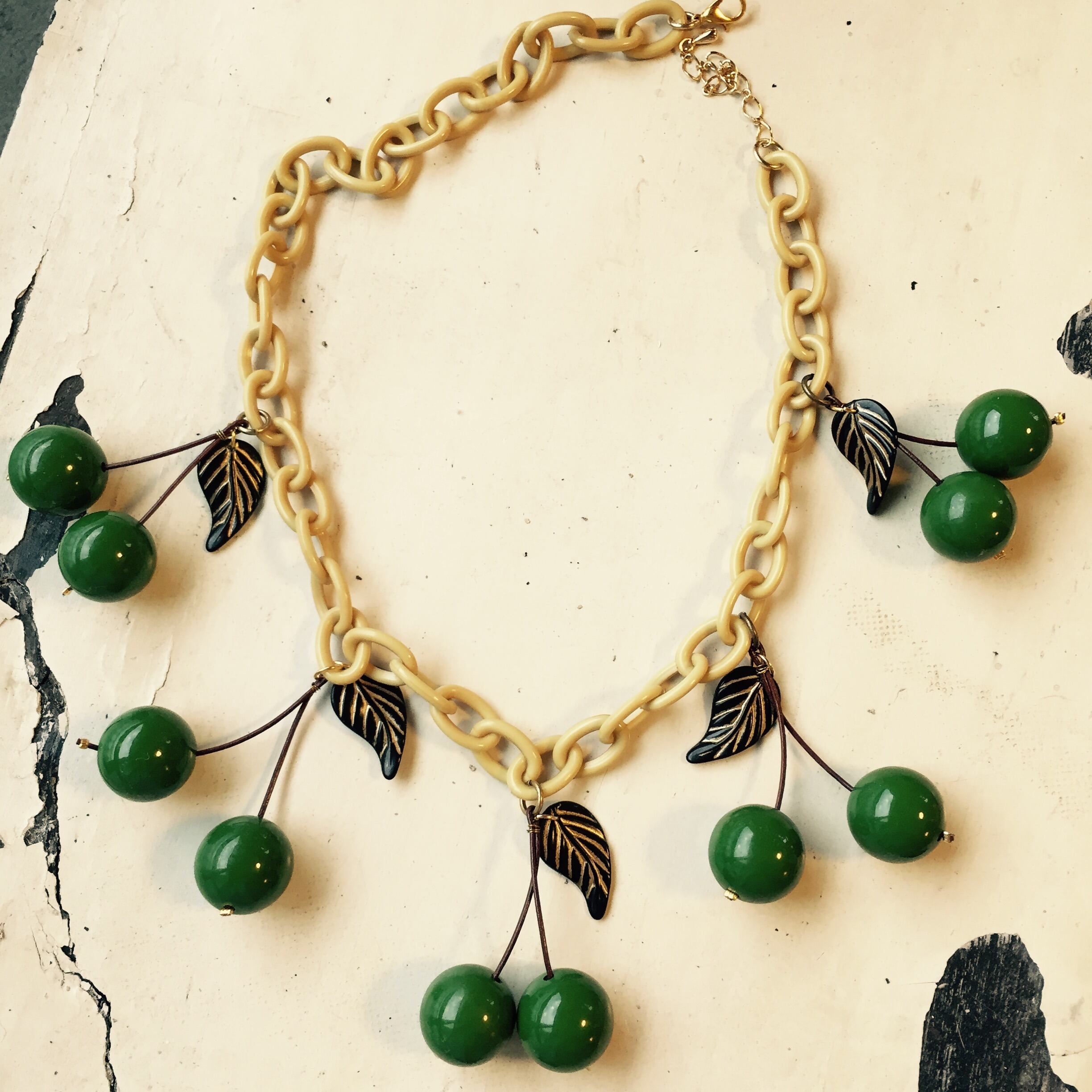 ベークライトのようなチェーンにGreenのcherryに葉は黒、茎が茶色です★