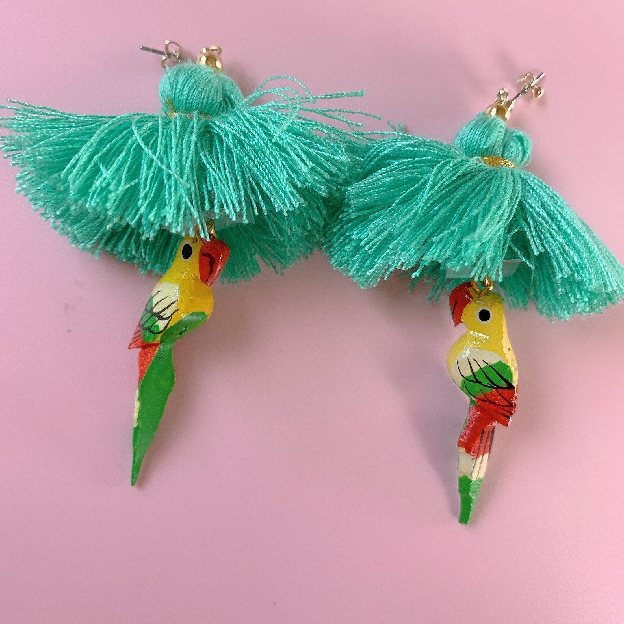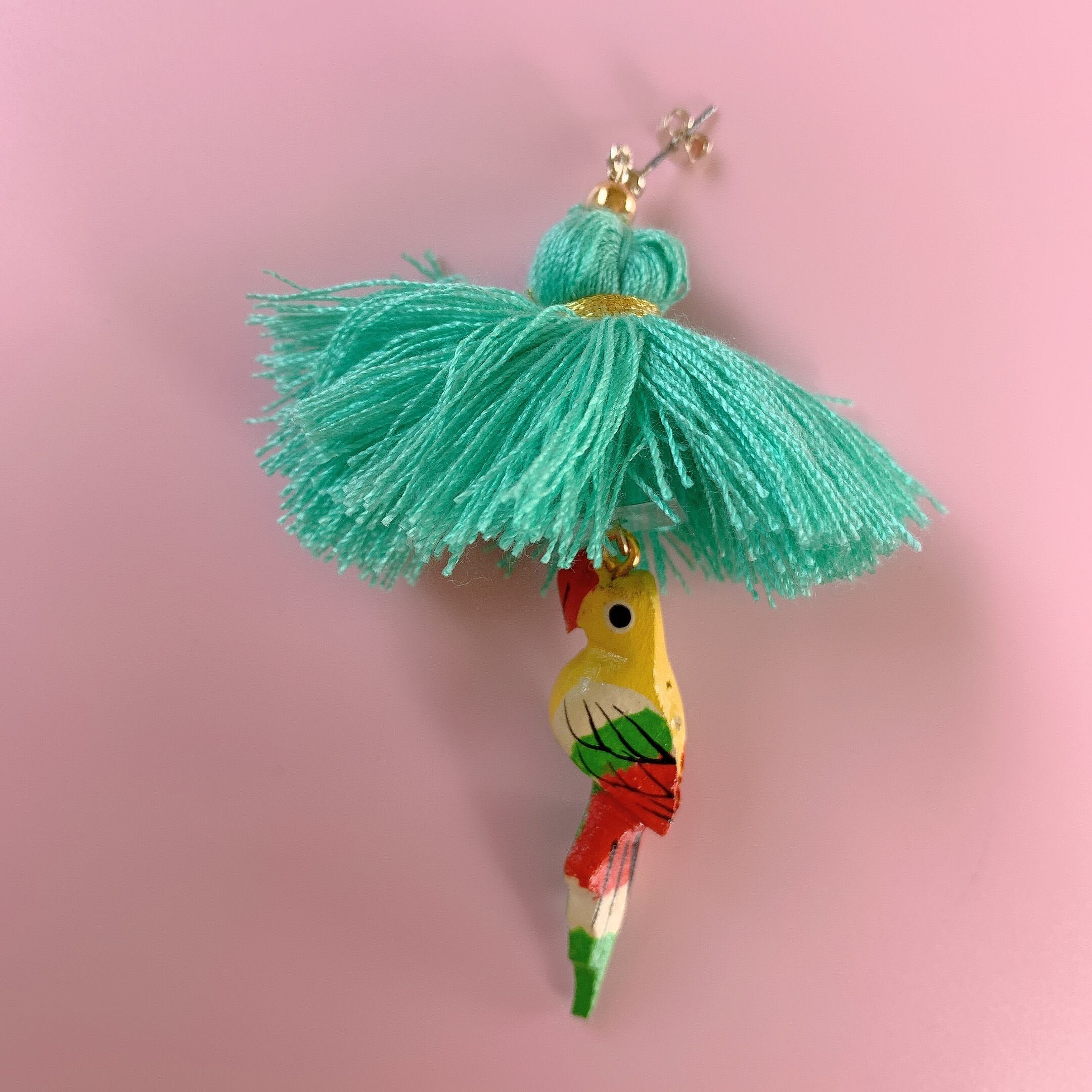 シーグリーンのボリューミーなタッセルがアクセントになるピアス。