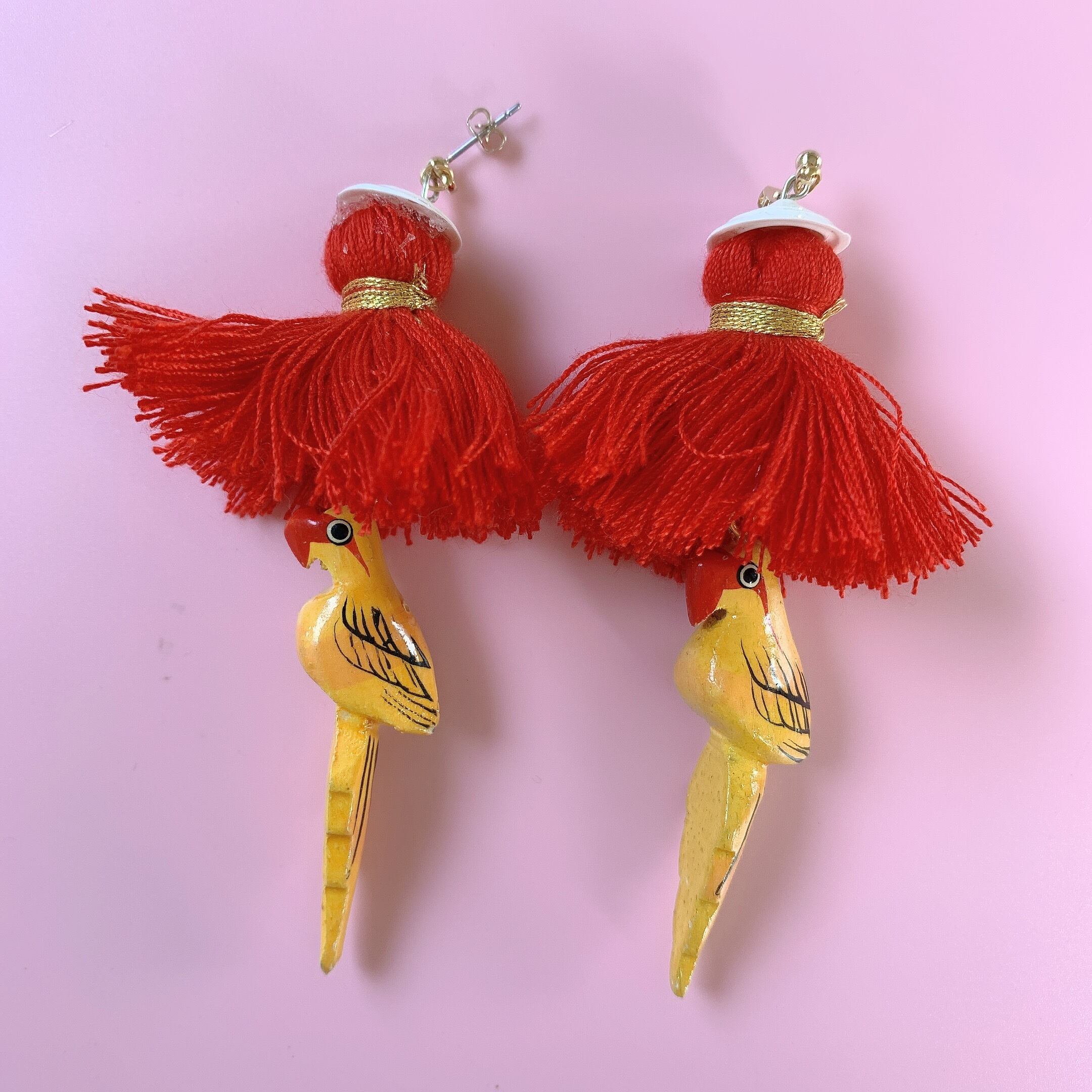 大きな赤いタッセルが可愛いい鳥さんのピアスです。