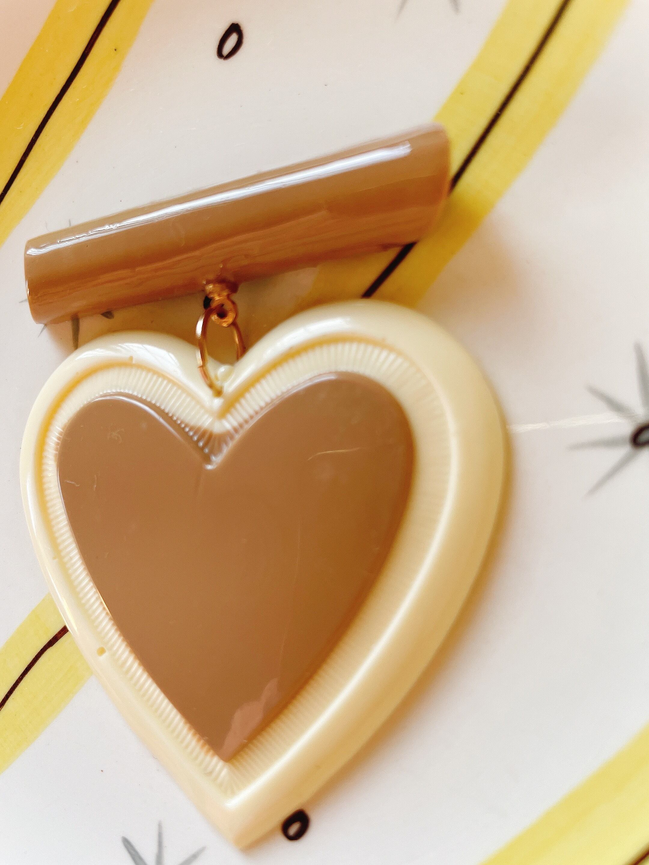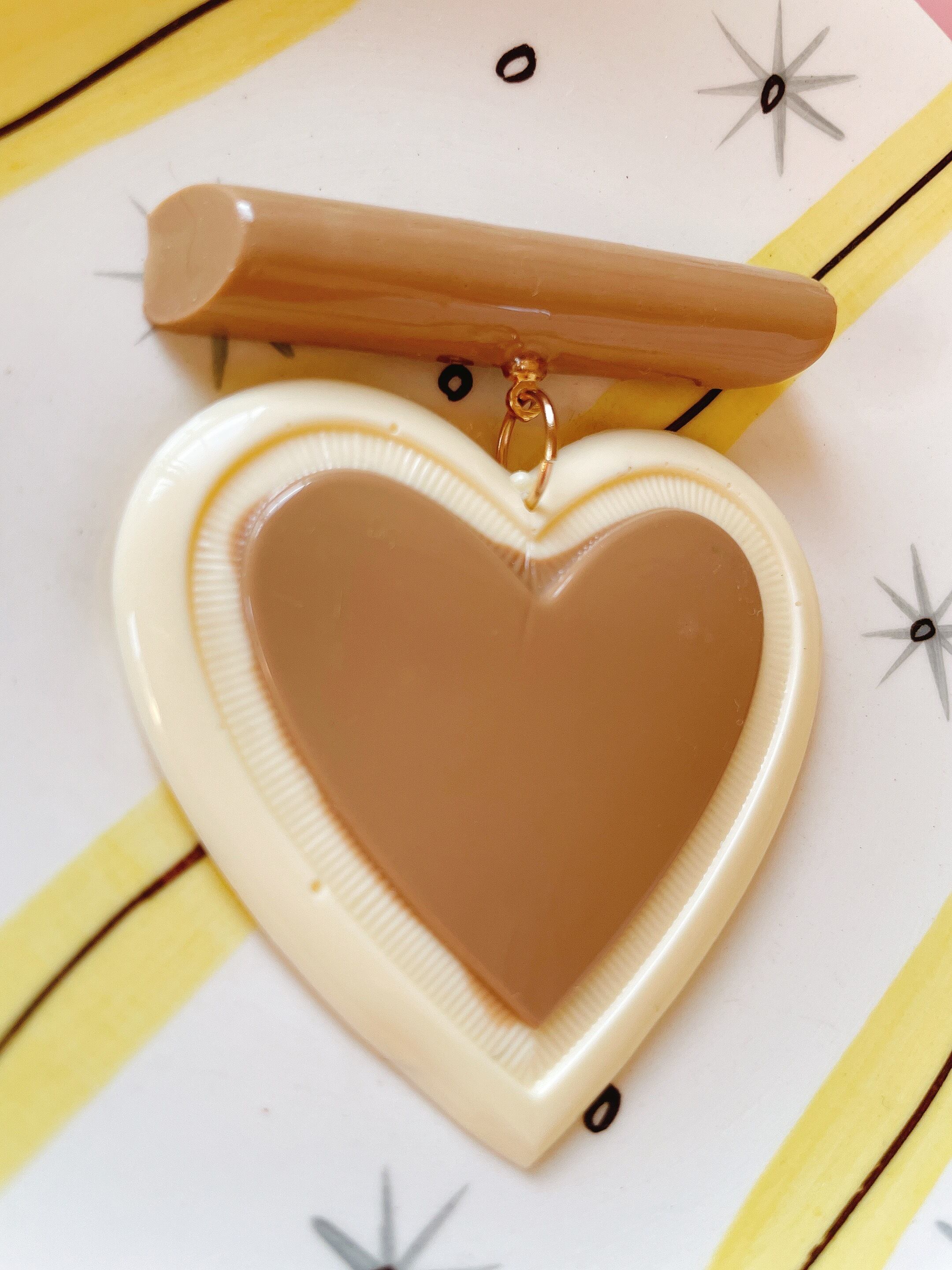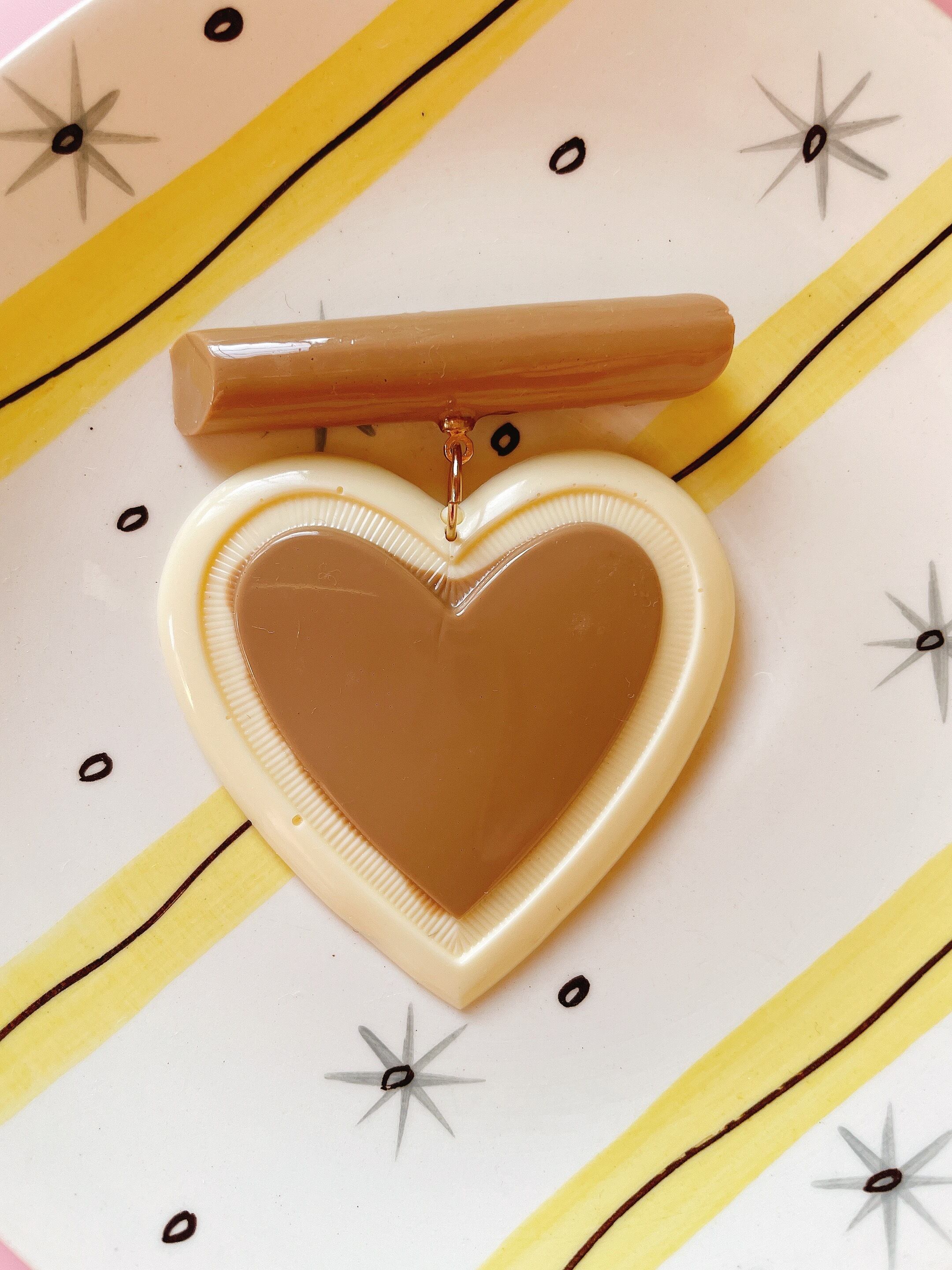 ホワイトチョコとミルクティーチョコのような色合いのハートブローチです。