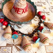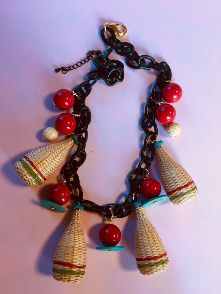 ブラックのチェーンにアトミックな赤玉とカゴ製のボトルのようなパーツが可愛いいネックレスです。